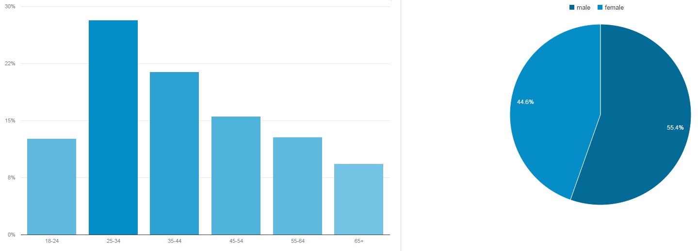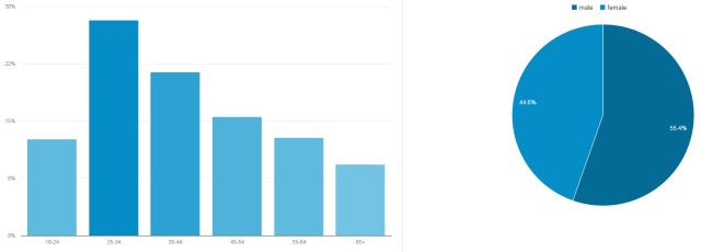 Marraskuusta lähtien Google Analytics on tarjonnut käyttäjilleen lisäksi tietoa sivulla kävijöiden sukupuolesta ja iästä, ja jos tähän dataan on luottaminen, niin 25-34-vuotiaat olivat ylivoimaisesti suurin ikäryhmä, jota sivustomme artikkelit kiinnostivat. Miehiä oli lukijoiden joukossa jonkin verran enemmän (55%) kuin naisia (45%). Lukijat vaikuttavat asuvan suurelta osin pääkaupunkiseudulla.