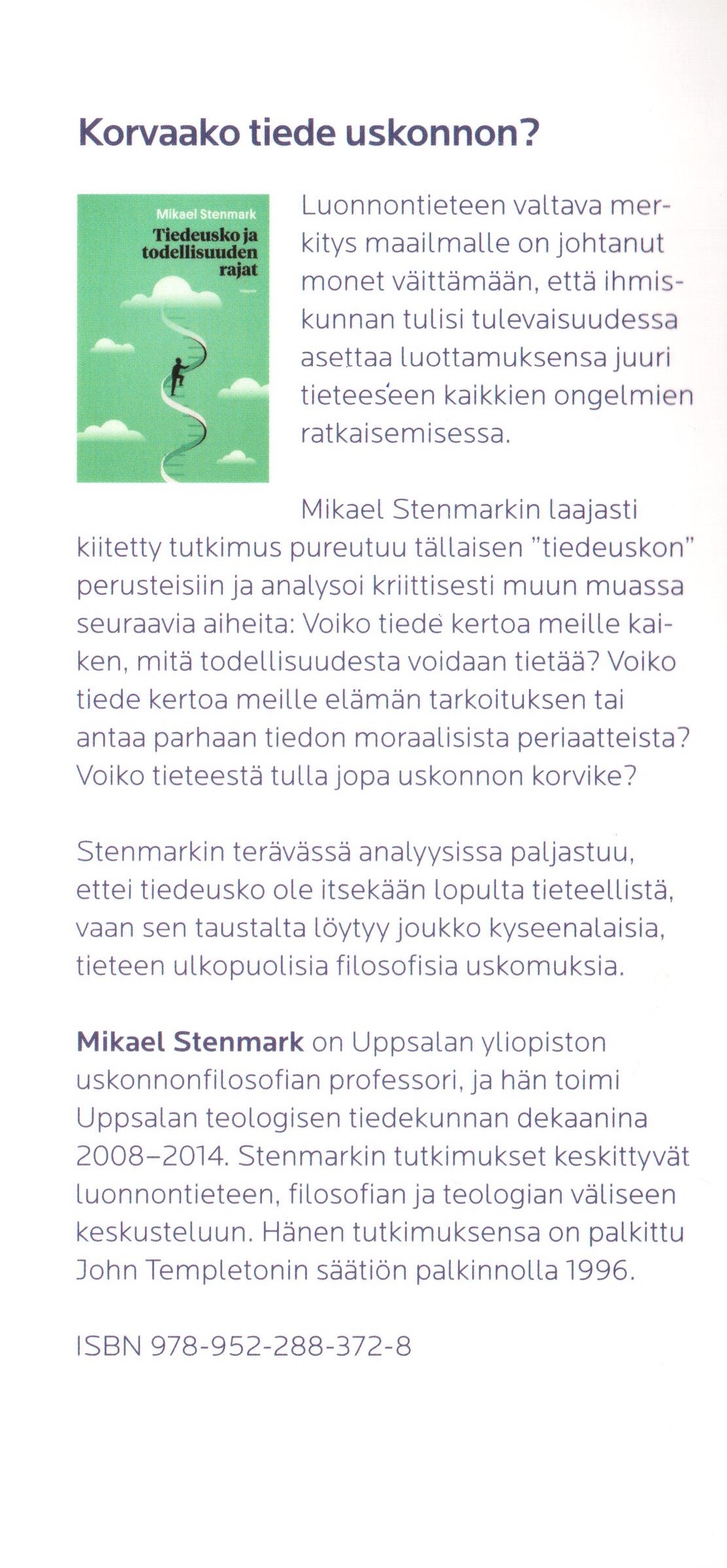 Tieteen ja uskonnon dialogi -kirjan kansilehdestä löytyy mainos skientismiä käsittelevästä Mikael Stenmarkin kirjasta.