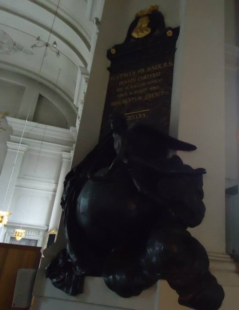 Vuonna 1710 Descartesin muistoksi tehty puinen veistos Adolf Fredrikin kirkossa Tukholmassa, jonka hautausmaalla Descartesin maalliset jäännökset lepäsivät ennen siirtoa Pariisiin (Kuva: kirjoittajan henkilökohtainen valokuva-arkisto)