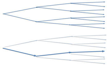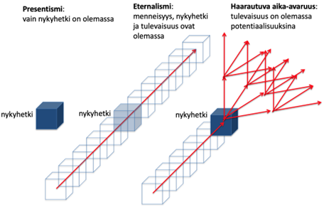 Kuva 3: Haarautuvan aika-avaruuden malli mahdollistaa aika-avaruuden käsitteen yhdistämisen tulevaisuuksien vaihtoehtoisten tapahtumankulkujen aitoon olemassaoloon.