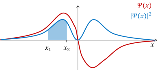 Kuva 4: Jos kvanttiaallon muoto (punainen viiva) tunnetaan, siitä voidaan laskea todennäköisyys hiukkasen tietylle sijainnille (sininen viiva) korottamalla aallonkorkeus eli amplitudi toiseen potenssiin.