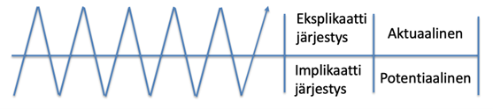 Kuva 6: Implikaatti järjestys -teorian mukaan tulevaisuuden potentiaalisista tiloista yksi aktualisoituu nykyhetkessä ja kääriytyy sitten takaisin implikaattiin järjestykseen.