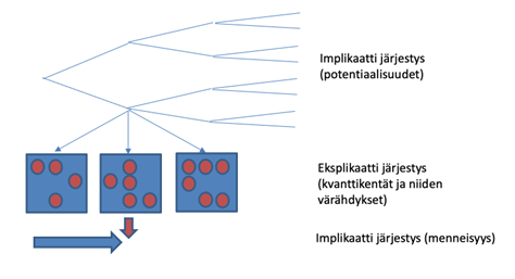Kukin aukikääriytyminen on kvanttikentän värähdys. Hiukkaset, jotka muodostavat eksplikaatin järjestyksen, eivät siis ole pysyviä fysikaalisia objekteja, vaan peräkkäisiä tapahtumia, jotka kääriytyvät jatkuvasti implikaatista järjestyksestä eksplikaattiin järjestykseen ja takaisin. Kvanttikentän värähdys siis vastaa kvanttisysteemin aktualisoitunutta tilaa.
