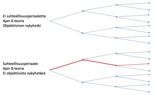 Jumalan ennaltatietämyksen voidaan esimerkiksi ajatella edellyttävän, että tulevaisuus on olemassa Jumalan näkökulmasta tarkasteltuna. Erityisen suhteellisuusteorian perustulkinnan mukaan tämä onkin täysin oikeutettu oletus: ovathan menneisyys, nykyisyys ja tulevaisuus samanarvoisesti olemassa. Kuten aiemmin totesin, tästä seuraa kuitenkin toinen ongelma: ihmisen vapaa tahto on mahdoton, koska tulevaisuus on jo olemassa, ja siten vaihtoehtoisia mahdollisia tulevaisuuksia ei ole. Ongelma heijastaa sitä, että aika-avaruuden rakenne määritellään ilman kvanttifysiikan potentiaalisuuden käsitettä, joka mahdollistaisi vaihtoehtoisten tulevaisuuksien olemassaolon. Väitöskirjassani osoitan, että jos tulevaisuus on jo olemassa Jumalan näkökulmasta, ihmisten vapaan tahdon ylläpitämiseksi aika-avaruudella on kuitenkin oltava haarautuva rakenne ajallisesta näkökulmasta tarkasteltuna.