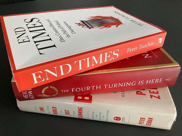 Lyhyen ajan sisään on ilmestynyt kolme kiinnostavaa teosta, jotka koettavat kurkistaa tulevaisuuteen. Ensimmäinen kirja on Peter Zeihanin The End of the World is Just the Beginning (2022), toinen Peter Turchinin End Times (2023) ja kolmas Neil Howen Fourth Turning is Here (2023). Zeihan on geopoliittinen strategi, joka analysoi maailmaa populaatioiden kehityksen, resurssien liikkumisen ja riittävyyden sekä globaalin maantieteen näkökulmasta. Zeihan pitää myös suosittua podcastia, jossa hän tarjoaa napakoita ja hauskoja analyysejä ajankohtaisista aiheista.