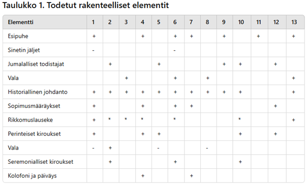 + tarkoittaa todennettuja elementtejä, – tarkoittaa poisjätettyjä elementtejä, * tarkoittaa pois jätettyjä, mutta rakenteellisesti implisiittisiä elementtejä.